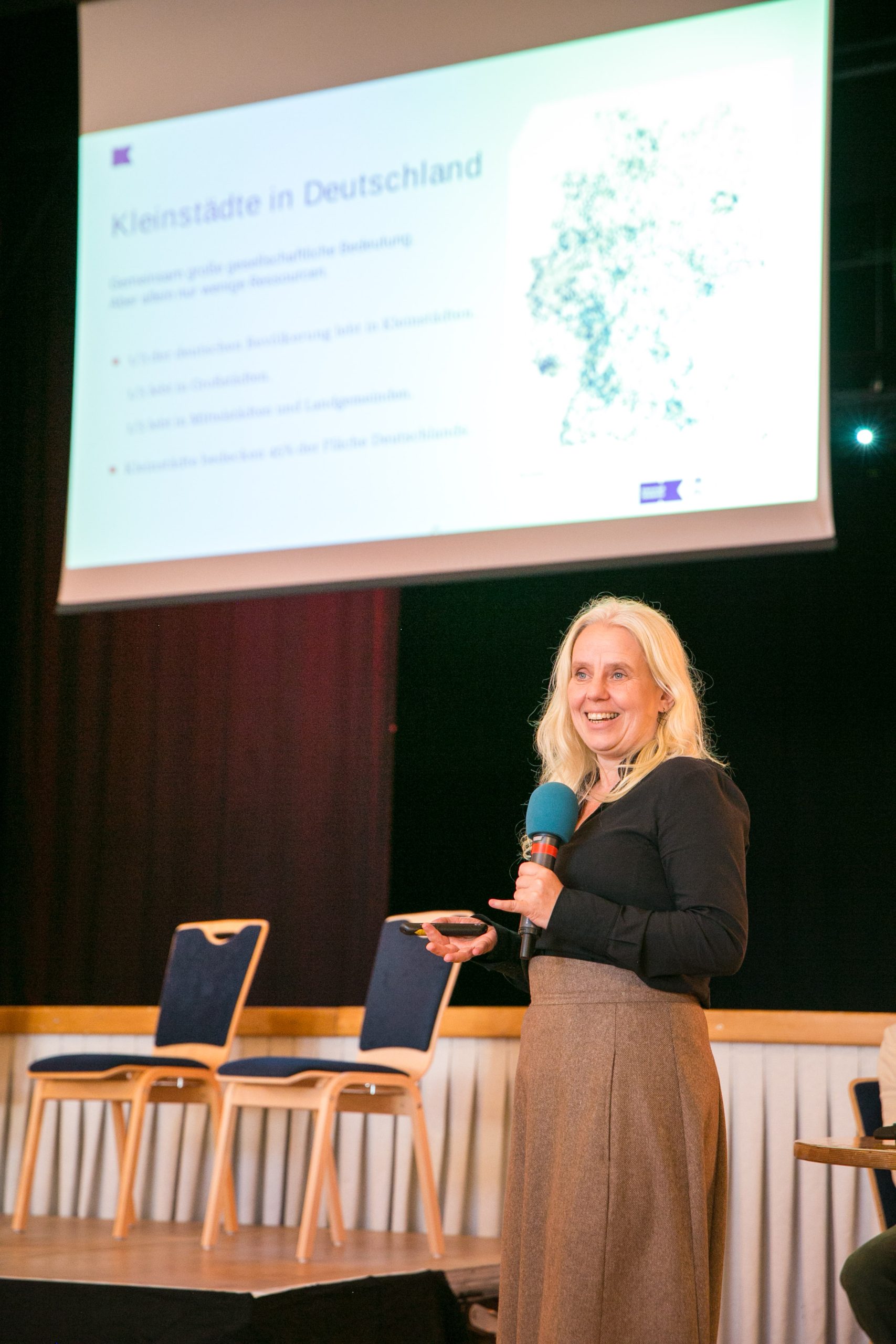 Eine Podiumsdiskussion brachte zentrale Aspekte zum Vorschein, die Kleinstädte von Großstädten unterscheiden. Es wurden sowohl die Vorteile als auch die Herausforderungen von Kleinstädten diskutiert. Einerseits können Kleinstädte durch kurze Wege, eine überschaubare Akteurslandschaft und eine starke Stadtleitung schnell voranschreiten. Andererseits kämpfen sie mit Problemen wie Überforderung, Fachkräftemangel und Finanznot.
