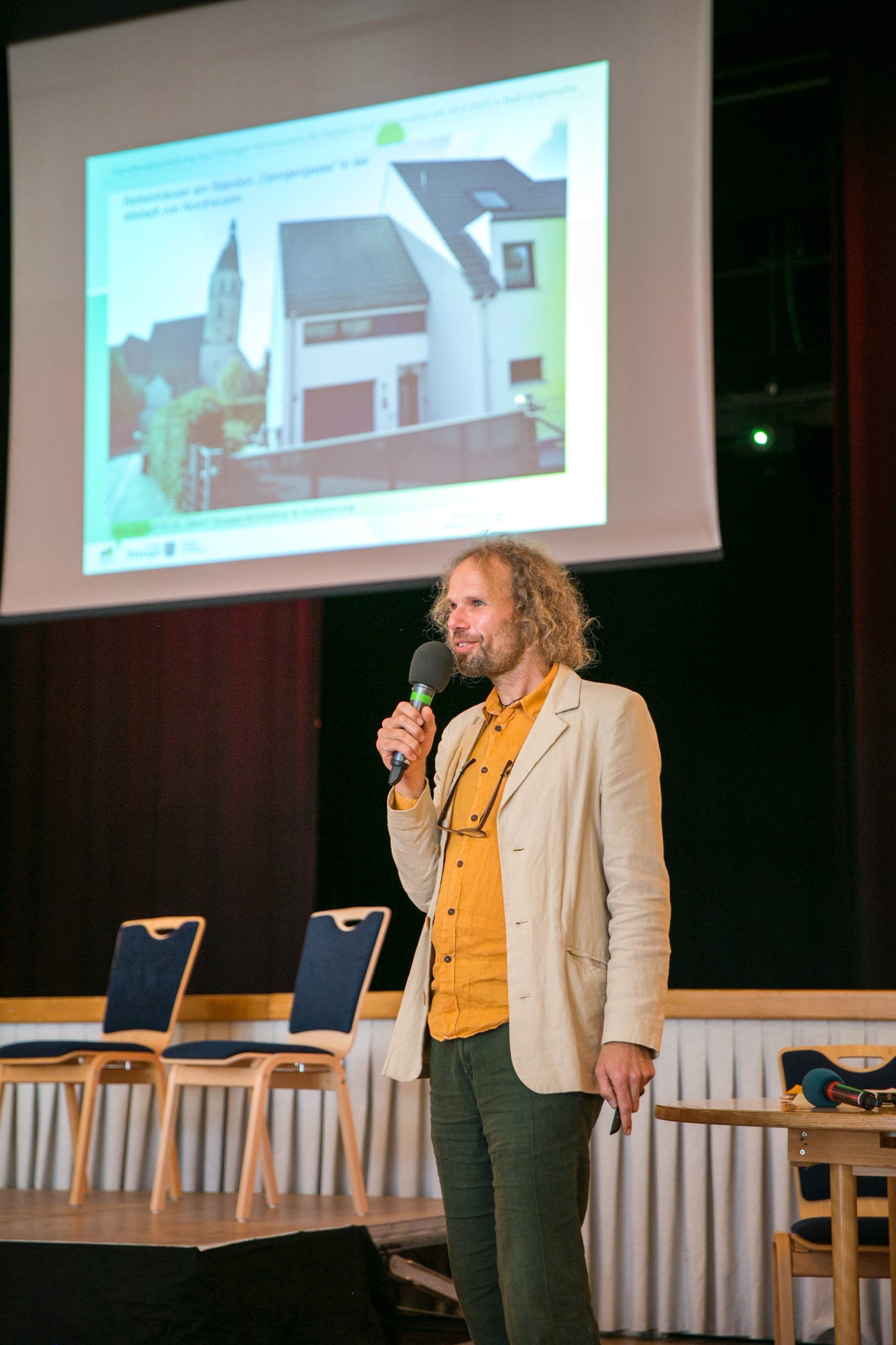 Am Nachmittag berichtete Siw Foge als Leiterin der Kleinstadt Akademie vom ersten bundesweiten Kleinstadtkongress im Juni 2026 in Wittenberge. Sie erläuterte auch die Entstehung und das Ziel des Netzwerkteams: die Kleinstädte in Deutschland künftig besser zu vernetzen um voneinander zu lernen und ihnen im Zuge bundespolitischer Entscheidungsprozesse eine stärkere Lobby zu geben. Zuversichtlich stimmende Impulse aus der Thüringer Kleinstadtentwicklung gab Steffen Groß als Koordinator der interdisziplinären Arbeitsgruppe „Begleitforschung“. Dr. Daniel Kretzschmar beleuchtete als Mitarbeiter der Professur für Landmanagement an der TU Dresden sowie des Büros „Prognose und Planung“ die Herausforderungen im Bereich Eigenheim- und Wohnungsbau. Sein Schwerpunkt lag dabei auf der Analyse von Wohnungsnachfrage und Potenzialflächen, mit dem Ziel, den Bedarf an Eigenheimen in Innenstadtlagen zu decken, anstatt Neubaugebiete am Stadtrand auszuweisen. In Bad Langensalza ist es – wie auch bspw. in Sömmerda oder Nordhausen – im Verbund mit weiteren Bestandssanierungen im Umfeld gelungen, die zentralen Stadtquartiere mit attraktiven Wohnqualitäten in der Altstadt aufzuwerten und somit einem Wegzug bestimmter Haushaltsgruppen vorzubeugen.